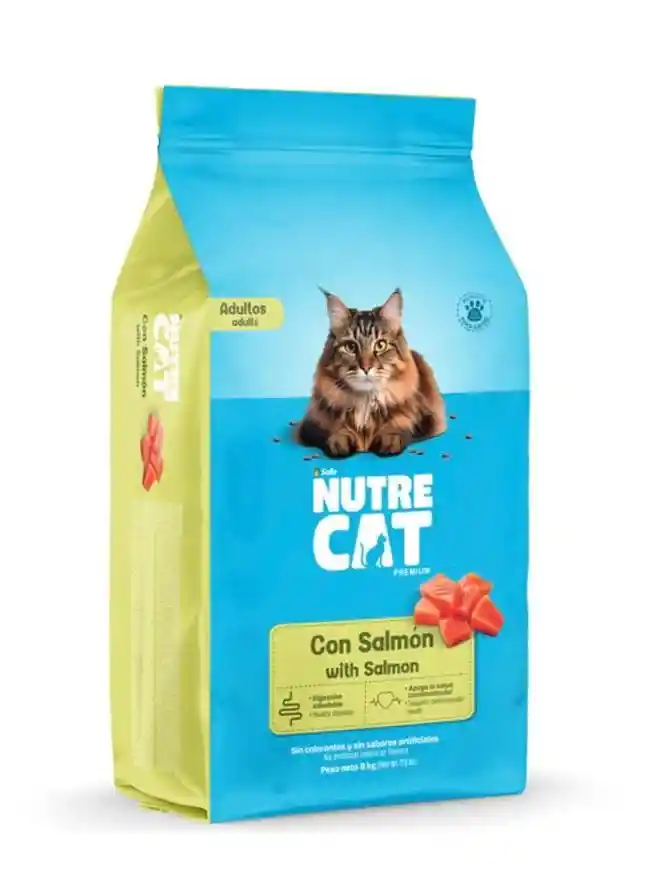 Nutrecat Salmón es un alimento completo y balanceado para gatos adultos, desarrollado para gatos de interior de baja actividad física. Su principal beneficio es la combinación del salmón, rico en proteínas de fácil digestión y ácidos grasos omega-3, con vitaminas, minerales y fibra, para apoyar la salud general, la digestión, el pelaje brillante, el sistema cardiovascular y el inmunológico.