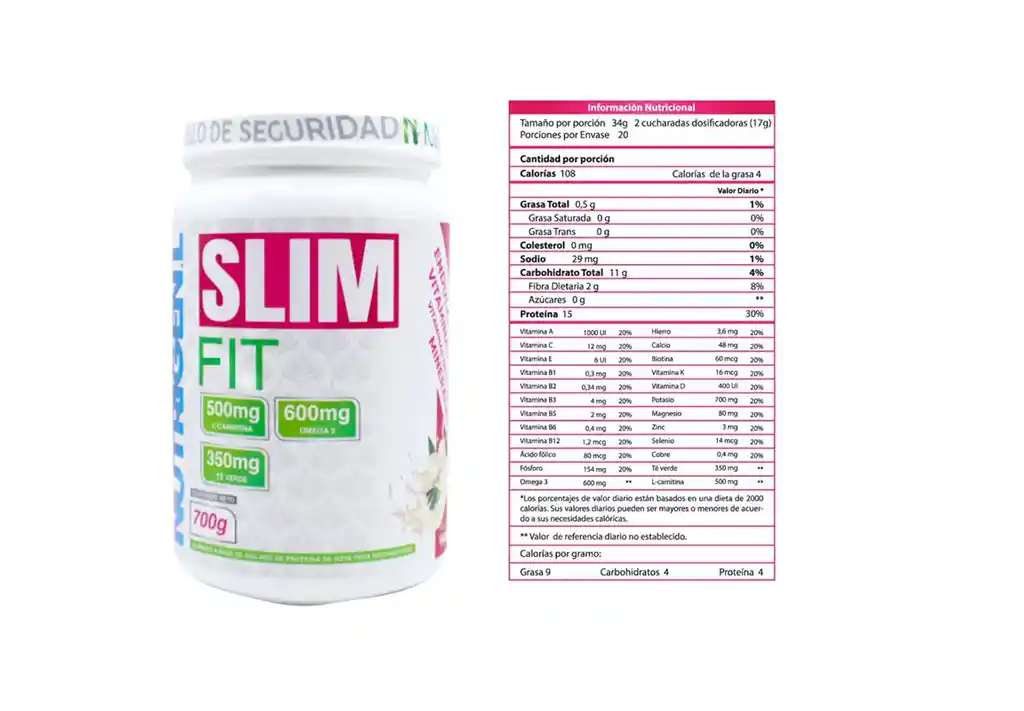 NUTRIGEN. L SLIM FIT: Alimento con alto contenido de proteína aislada, bajo contenido de carbohidratos, aporte de fibra y grasa proveniente de omega 3, además de contener un alto porcentaje de vitaminas y minerales, SLIM FIT complementa nuestra alimentación debido a que fue desarrollado equilibradamente para darnos los aportes nutricionales adecuados, adicional a esto contiene L- carnitina y Té verde para ayudarnos con nuestro metabolismo. CONTENIDO NETO: 700g SABOR: VAINILLA 20 servicios