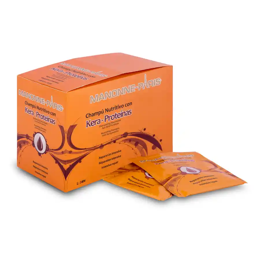 CHAMPÚ NUTRITIVO CON KERA-PROTEÍNAS Champú con Keratina y Proteínas Hidrolizadas de Trigo, complementos ideales para reparar intensivamente la fibra capilar desde la cutícula hasta la corteza, aportar nutrición, protección, resistencia y brillo. MODO DE EMPLEO: Aplicar sobre el cabello húmedo, masajear circularmente con la yema de los dedos y enjuagar con abundante agua. Presentación: Caja sachet x 30ml x 24 unds
