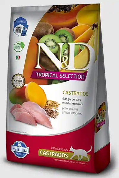 Pollo-Cereales y Frutas Tropicales Tropical Selection Farmina. Mantener el Peso Ideal y la Masa Muscular de Los Gatos Esterilizados Gracias a su Alto Contenido de Proteínas de Origen Animal Cereales Ancestrales de Bajo Índice Glucémico Que Favorecen la Saciedad y el Control Energético y Frutas Tropicales Ricas en Antioxidantes Que Fortalecen el Sistema Inmunológico. Además Contribuye a la Digestión Saludable y al Cuidado Del Tracto Urinario Mediante Una Fórmula Balanceada y Altamente Digestible.
