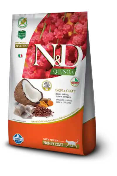 Pescado, Quinua, Coco y Cúrcuma Alimento completo y balanceado para gatos adultos con piel sensible
