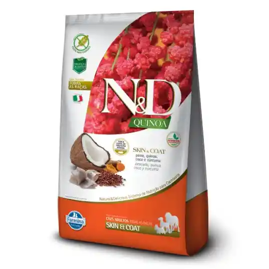 "Pescado, Quinua, Coco y Cúrcuma Alimento completo y balanceado para perros adultos con piel sensible"