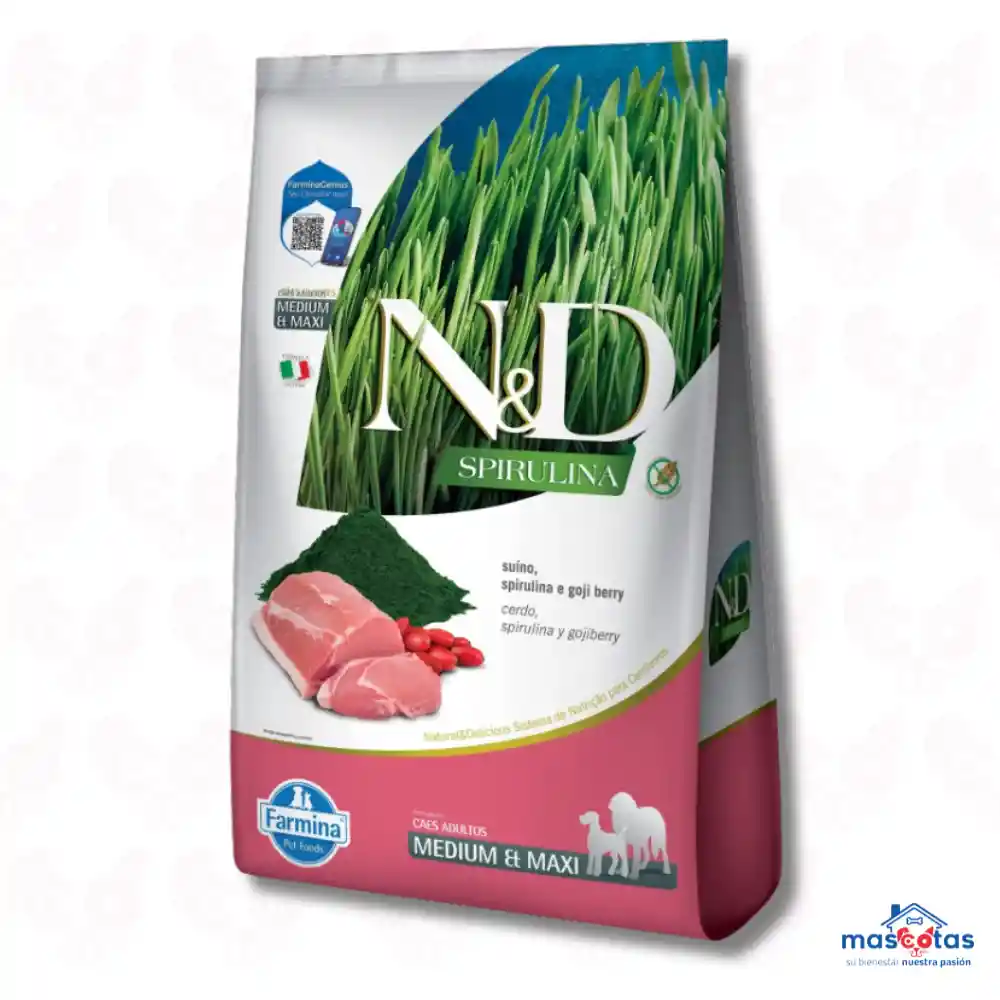 El N&D Spirulina Adult Medium & Maxi de Farmina es un alimento premium diseñado para perros adultos de razas medianas y grandes que necesitan una nutrición completa y rica en antioxidantes. Elaborado con ingredientes naturales como carne de cerdo, espirulina y goji berry, este alimento promueve la salud general, ayuda a reducir inflamaciones y proporciona energía sostenida. La espirulina y el goji berry, conocidos por sus beneficios antioxidantes, fortalecen el sistema inmune y protegen contra el daño celular, mientras que las proteínas de alta calidad de la carne de cerdo ayudan a mantener una masa muscular saludable. Beneficios: Fortalecimiento del Sistema Inmunológico: El goji berry y la espirulina aportan antioxidantes que refuerzan las defensas naturales, ayudando a proteger al perro contra enfermedades. Mejora de la Salud Digestiva: La fórmula es fácil de digerir, lo que facilita la absorción de nutrientes y promueve una digestión saludable. Piel y Pelaje Radiantes: Ingredientes ricos en omega y antioxidantes contribuyen a un pelaje brillante y a una piel sana, previniendo problemas cutáneos. Aporte Energético Sostenido: La combinación de proteínas de alta calidad y carbohidratos balanceados proporciona energía duradera, ideal para perros activos de razas medianas y grandes. Salud Muscular y Articular: Los ingredientes de origen animal ayudan a mantener la masa muscular, mientras que el aporte de nutrientes respalda la salud de las articulaciones en perros grandes. Con N&D Spirulina Adult Medium & Maxi, Farmina ofrece una dieta que no solo satisface las necesidades nutricionales de los perros adultos, sino que también apoya su bienestar integral a través de ingredientes naturales de alta calidad. Ingredientes: Cerdo (carne de cerdo, harina de chicharrón (piel de cerdo) – mín. 6%), huevo en polvo, harina de vísceras de pollo, harina de pescado, almidón de papa, almidón de mandioca, aceite de pescado, aceite de pollo, grasa de cerdo, pulpa de remolacha, cáscara de guisante, alfalfa deshidratada, semilla de linaza, celulosa en polvo, semilla de psyllium, levadura seca de cervecería (Saccharomyces cerevisiae), biomasa de microalgas deshidratadas (Spirulina spp.) (mín. 0,5%), gojiberry (mín. 0,075%), zanahoria deshidratada, espinaca deshidratado, extracto de aloe vera, cúrcuma en polvo, betacaroteno, aditivos prebióticos (FOS y MOS), DL-metionina, taurina, L-carnitina, sulfato de condroitina, sulfato de glucosamina, aditivos adsorbentes (extracto de yuca (Manihot esculenta) y zeolita), hidrolizado de hígado de aves y cerdos, vitaminas (A, D3, E, B1, B2, B5, B6, B12, C, biotina, niacina, ácido fólico, cloruro de colina), cloruro de sodio, cloruro de potasio, fosfato bicálcico, hierro aminoácido quelato, cobre aminoácido quelato, zinc aminoácido quelato, manganeso aminoácido quelato, proteinato de selenio, yodato de calcio, propionato de calcio, concentrado de tocoferoles. Eventuales sustitutivos: proteína hidrolizada de pescado, proteína hidrolizada de pollo.