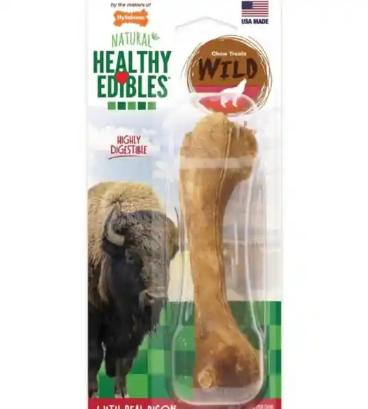 Los Healthy Edibles son 100 % comestibles. Deleite a su perro con sus sabores favoritos de la naturaleza con las golosinas para masticar WILD, fabricadas en Estados Unidos. ¡Estas sabrosas golosinas se asemejan a los huesos reales y están hechas con bisonte y venado real ! Y lograran satisfacer el lado salvaje de su perro y lo mantendrán ocupado con una fórmula duradera y altamente digerible. Estas golosinas saludables para perros de bisonte y venado son un bocado que le hará la boca agua y con el que se sentirá bien al darle a su amigo peludo, ya que no contienen colorantes, saborizantes ni conservantes artificiales.