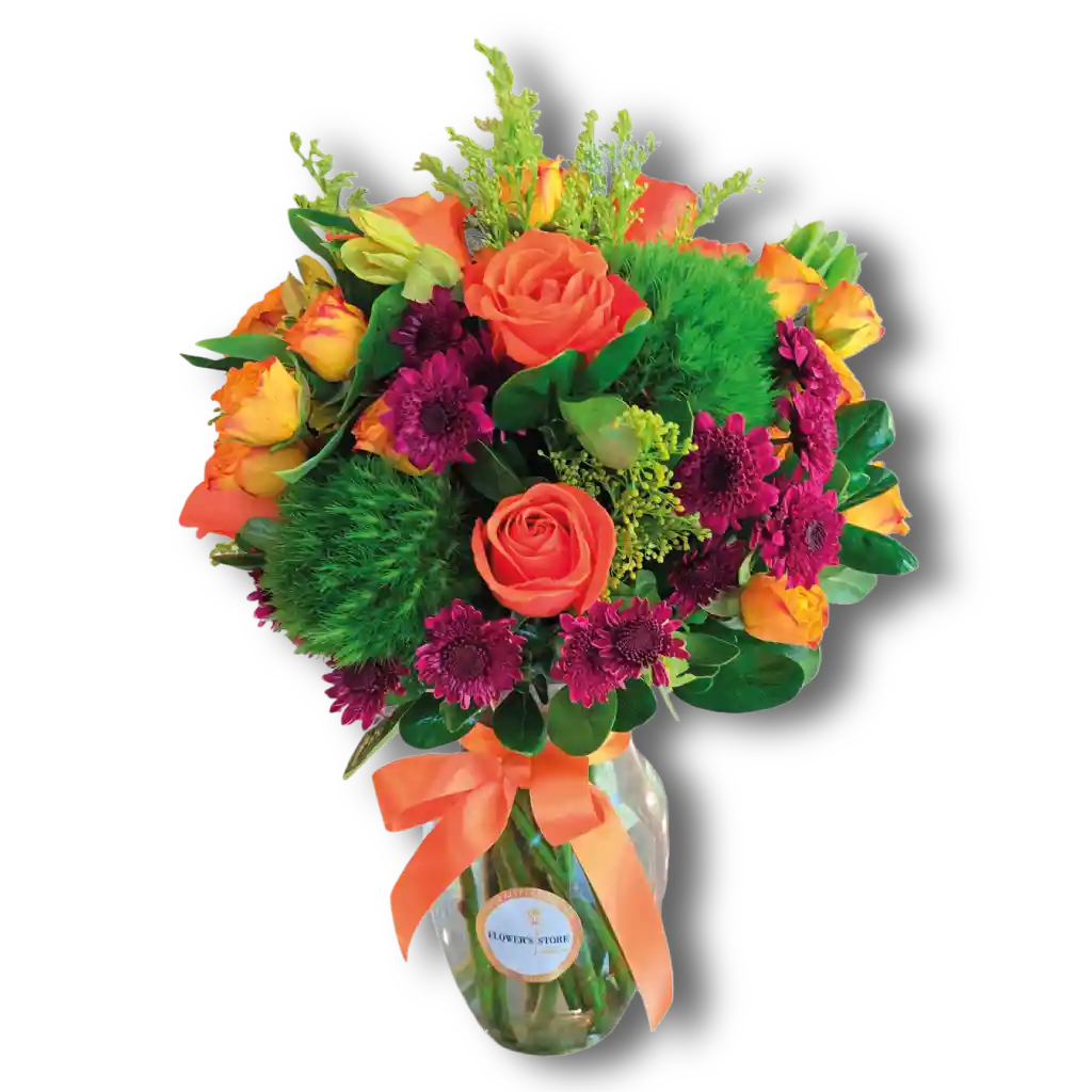 • Rosas naranjas • Coquetas • Follaje • Florero de vidrio