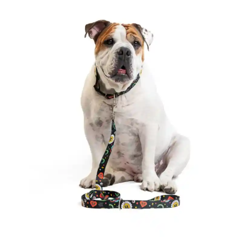 Este bicombo de collar y correa está elaborado en poliéster, sublimado con diversos y coloridos diseños. Herrajes de zamak. Es suave con el pelaje, brinda confort y seguridad.