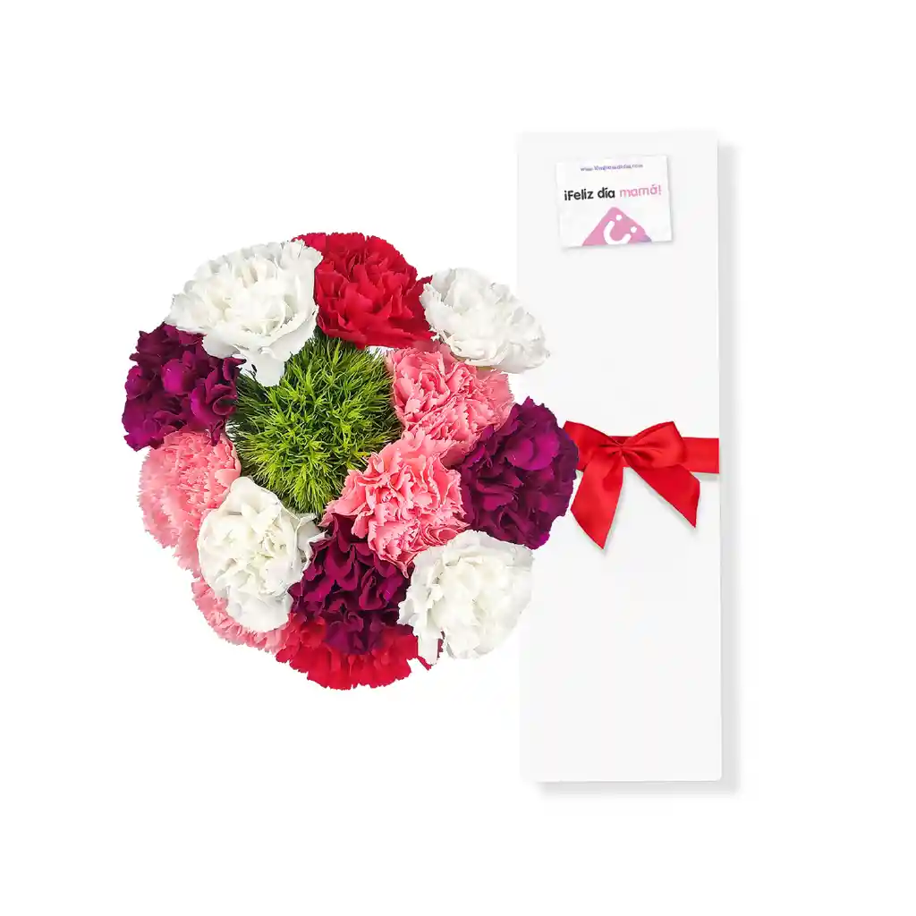 Ramo de claveles Naturales con 12 unidades dentro de una caja de carton reciclado y una tarjeta dedicatoria.
