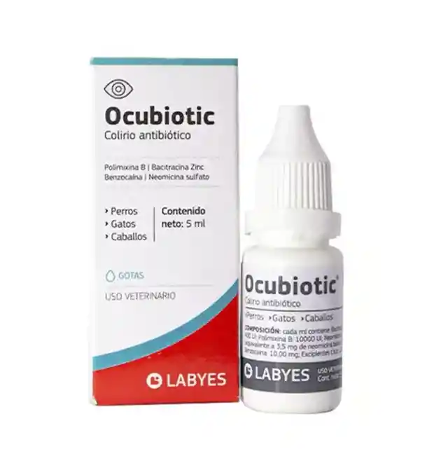 Ocubiotic colirio con efecto triple antibiótico. Se destaca por el gran espectro bactericida de sus antibióticos -Neomicina, Polimixina B y Bacitracina Zn- y la acción sinérgica de los mismos. Posee efecto analgésico, evita lesiones autoinfligidas por rascado. Su excipiente mantiene la humedad, permite mejor difusión y persistencia de los principios activos sobre la superficie ocular y brinda mayor confort al paciente. Está indicado para su uso en caninos, felinos y equinos.