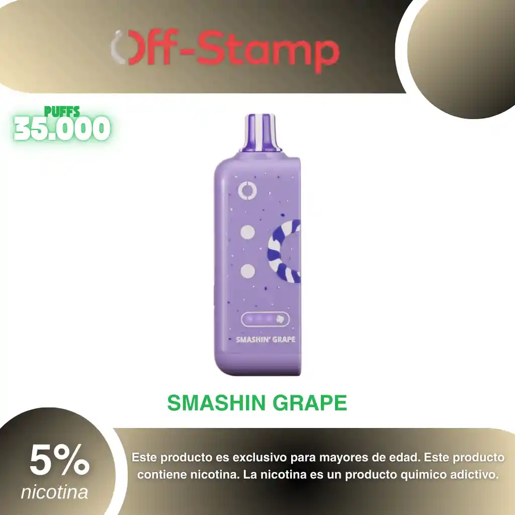 Off-Stamp Classic Pod 35.000 Puffs, Sabor Uva 5% PROHIBIDA LA VENTA A MENORES DE EDAD. ADVERTENCIA: ESTE PRODUCTO CONTIENE NICOTINA, LA NICOTINA ES UNA SUSTANCIA QUIMICA ADICTIVA Y NOCIVA PARA LA SALUD. Los líquidos para vapeo contienen: propilenglicol USP, glicerina USP, sabor artificial y nicotina. Este producto puede contener nicotina, una sustancia altamente adictiva que puede generar dependencia, posibles afectaciones arteriales, cardiacas, pulmonares y otras aun no identificadas. No se recomienda su uso a mujeres en embarazo, puede generar lesiones al feto. Mantener alejado de niños y mascotas. No ingerir, puede generar irritación y/o intoxicación. Por favor antes de consumir consulte a su médico posibles afectaciones o sensibilidad a alguno de sus componentes. Los componentes de este producto pueden aumentar la sensación de ansiedad En caso de notar alguna reacción adversa por favor suspenda su uso de manera inmediata. Siga las instrucciones en el envase. No alterar sus componentes. Adquiera sus productos en sitios de confianza No use productos piratas, alterados, o en los cuales no pueda comprobar su buena procedencia, Verifique la reputación del fabricante y distribuidor antes de adquirir cualquier producto Si no es usuario fumador o vapeador no se recomienda su uso bajo ninguna circunstancia Al usar este producto usted es consciente que este producto puede generar afectaciones a su salud, incluyendo aquellas que a la fecha de la compra no se han identificado y que pueden aparecer a largo plazo.