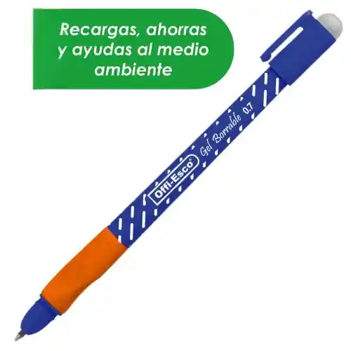 Lapicero borrable de tapa , marca OFFI ESCO. Su tinta borrable es de calidad y se borra fácilmente sin desgastar el papel. Permite cambio de repuesto recárgalo cuantas veces quieras. Tinta Gel Punta de carburo de tungsteno. Zona de agarre de goma en forma triangular, para un agarre cómodo y seguro. Gran durabilidad, suavidad incomparable, agradable escritura sin interrupciones. Para cambiar la mina que tiene el bolígrafo por la nueva debes abrir el bolígrafo, entre la parte de naranja y el cuerpo desenroscando las dos partes, retirar la mina gastada e instalar la nueva.