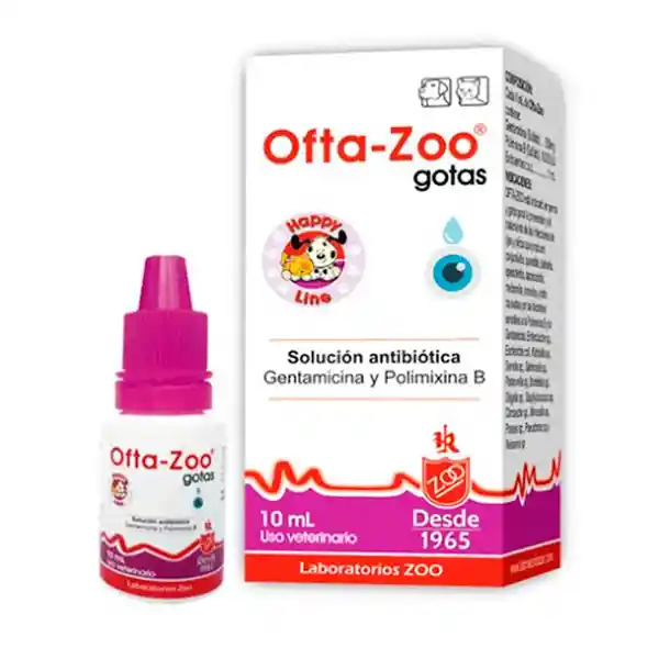 Ofta-Zoo es una solución oftálmica y ótica antibiótica de uso veterinario para perros y gatos, formulada por Laboratorios ZOO. Contiene gentamicina y polimixina B, útil para tratar infecciones, conjuntivitis, queratitis y otitis. Ayuda a aliviar dolor, prurito e irritación, y debe utilizarse bajo supervisión veterinaria.