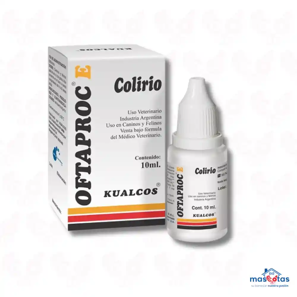 Oftaproc E es un colirio oftálmico veterinario para perros y gatos, una solución que combina antibióticos (Neomicina, Polimixina B) y un antiinflamatorio (Dexametasona) para tratar infecciones bacterianas y la inflamación en los ojos, como conjuntivitis, queratitis y úlceras corneales, aliviando el dolor y promoviendo la cicatrización. Se aplica tópicamente en el ojo afectado, generalmente por no más de dos semanas, siempre bajo supervisión veterinaria. Descripción detallada Uso principal: Tratamiento de infecciones oculares bacterianas y procesos inflamatorios en caninos y felinos. Indicaciones: Conjuntivitis (primaria y secundaria), quemosis, queratitis (superficial y ulcerosa), erosiones corneales y como coadyuvante post-quirúrgico. Componentes activos: Neomicina y Polimixina B: Antibióticos de amplio espectro que combaten bacterias. Dexametasona: Corticoide antiinflamatorio que reduce la hinchazón y el enrojecimiento. Mecanismo de acción: Actúa eliminando bacterias y disminuyendo la respuesta inflamatoria, lo que alivia el dolor, la molestia y ayuda a la re-epitelización corneal. Presentación: Solución oftálmica en frasco gotero de 10 ml. Modo de aplicación: 1-2 gotas en el saco conjuntival, 4-6 veces al día, máximo 2 semanas (seguir siempre indicaciones del veterinario). Importante: Es un medicamento de uso exclusivo veterinario; la prescripción y duración del tratamiento deben ser dictadas por un médico veterinario.