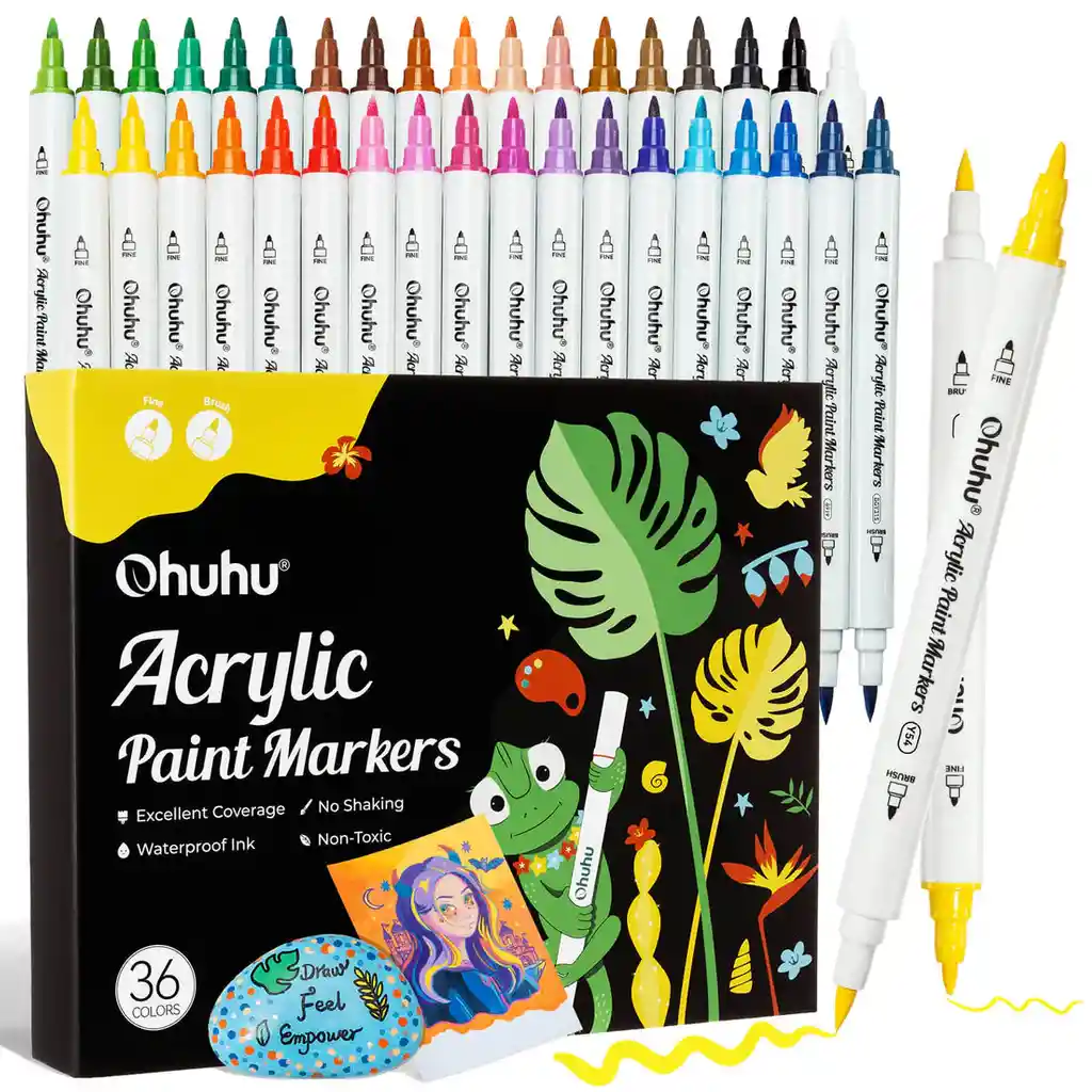 Set de 36 marcadores acrílicos con doble punta: pincel flexible y punta fina. Colores surtidos vibrantes y duraderos en tinta acrílica. Versatilidad para trazo ancho y detalle preciso en un solo marcador. Ideal para ilustración, lettering, decoración de superficies diversas y proyectos DIY.