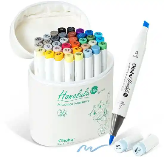 Set profesional de 36 marcadores con alcohol, tonos intensos y vibrantes. Doble punta: biselada para trazos amplios y pincel para detalles precisos. Tinta fluida sin corrimiento, excelente para ilustración, diseño, sketching y lettering artístico. Empaque blanco edición limitada.