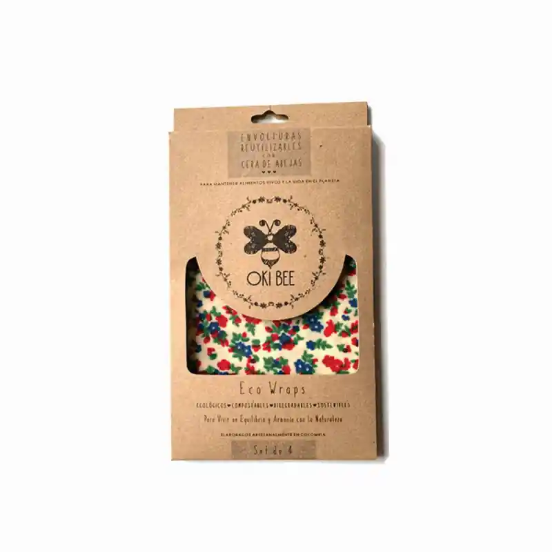 Set x 4 Oki Bee Eco Wraps XS (11x11 cms) . Envolturas Reutilizables con Cera de Abejas para conservar alimentos. Elaboradas artesanalmente en Colombia con tela de algodón. cera de abejas. resina de pino y aceite de coco orgánico. ECO AMIGABLES. SOSTENIBLES. COMPOSTABLES y BIODEGRADABLES. Dur 1 año. Se deben lavar con agua fría. sin restregar ni retorcer y con jabón líquido suave solo cuando sea necesario. a veces limpiadoras con un pañito húmedo es suficiente. Recomendaciones. No se recomienda para carnes crudas o empacar comida caliente. No exponer al sol directo o a fuentes de calor como horno o microondas. Para guardar carnes crudas en nevera y congelador se sugiere usar un recipiente y cubrirlo con nuestros ecowraps.