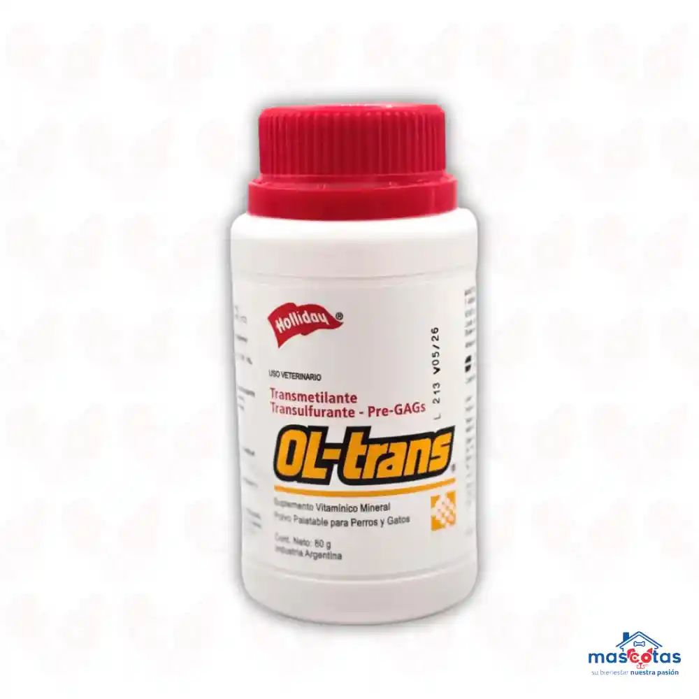 OL-Trans es un suplemento nutricional para perros y gatos que actúa como reconstituyente, especialmente indicado para problemas osteoarticulares, hepatopatías y dermatitis secundarias a insuficiencia hepática. Se presenta en polvo palatable y ayuda a prevenir o tratar estas patologías Función principal: OL-Trans es un suplemento vitamínico y mineral que actúa como reconstituyente, promoviendo la salud ósea y cutánea en perros y gatos. Indicaciones: Prevención y tratamiento de patologías osteoarticulares, como osteoporosis, displasia de cadera, y problemas articulares degenerativos. Coadyuvante en la reparación de fracturas. Tratamiento de hepatopatías (enfermedades del hígado). Dermatitis secundarias a insuficiencia hepática. Forma de administración: Se presenta en polvo palatable y se mezcla con la comida diaria. Dosificación: La dosis recomendada es de 1/2 cuchara por día para animales de hasta 5 kg y 1 cuchara por día para animales de más de 5 kg Composición: Contiene ingredientes como calcio, L-metionina, L-lisina, colina, L-cistina, ATP, magnesio y ácido fólico, entre otros , según Tierragro. Recomendaciones: Se recomienda consultar con un veterinario para determinar la duración del tratamiento y ajustar la dosis según la evolución del cuadro clínico.