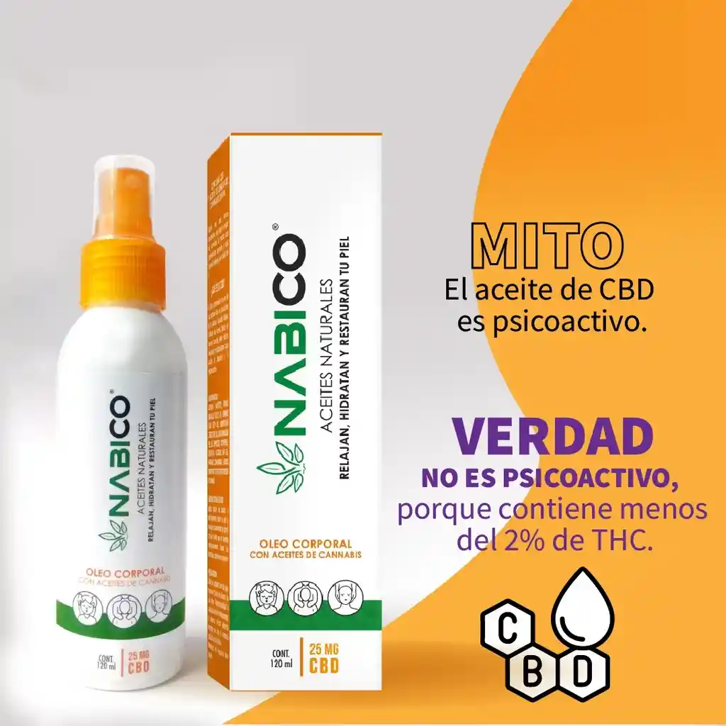 Nabico Oleo Corporal es una receta de aceites naturales que relajan, hidratan y restauran tu piel. Ideal para hacer masajes de relajación o descanso. También puedes agregarlo en tu rutina diaria de cuidado para tu piel. • Mezcla de aceites naturales. • Olor agradable y delicado. • Registro Invima NSOC13041-22CO • Producto de uso tópico y venta libre. Además del aceite de semilla de cannabis sativa y aceite CBD, su formula contiene: Aceite de Limonaria: Este aceite esencial tiene numerosas propiedades terapéuticas y otras tantas aplicaciones. Destacan sus propiedades antimicrobianas, antivirales, ansiolíticas, circulatorias y antiinflamatorias. Aceite de almendra dulce Gracias a su acción emoliente puede aplicarse en el cuerpo para dejar la piel agradablemente suave sin necesidad de usar una crema hidratante.