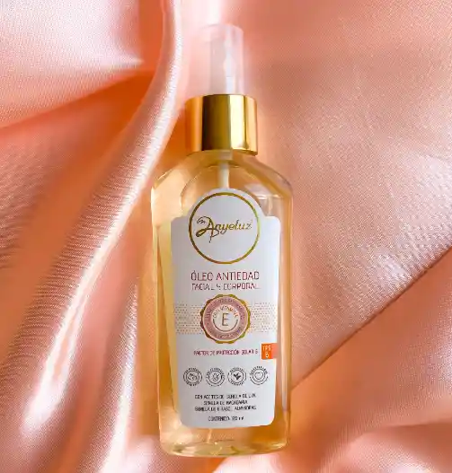 El Óleo Antiedad cuenta con vitamina E y aceites ricos en Ácido linoleico y otros ácidos grasos insaturados que fortalece la función natural de la barrera de la piel, extendiéndose y se absorbiendose con rapidez al momento de la aplicación. Sólo con un masaje normal se mejorará la elasticidad de la piel, previniendo el envejecimiento prematuro, la aparición de líneas de expresión y de estrías cutáneas. Modo de uso Facial: En las mañanas antes del maquillaje aplicar con la yema de los dedos en forma ascendente en todo el rostro permitiendo que la piel quede hidratada y lista para el maquillaje. En las noches puede utilizarse para retirar el maquillaje. Aplicar el producto con un pañito o con la yema de los dedos por medio de un suave masaje. Aplicar con la yema de los dedos por medio de un suave masaje en el área del rostro en la que se desee prevenir el envejecimiento prematuro y la aparición de las líneas de expresión. Corporal: Después del baño con la piel húmeda aplicar con las palmas de las manos uniformemente en todo el cuerpo en las zonas de mayor resequedad, ayudando a hidratar y a nutrir la piel para mayor elasticidad.