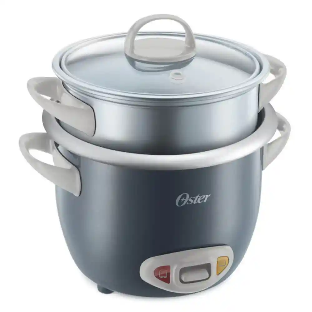 Mini arrocera multiusos de 1.5 con una bandeja para cocer rápidamente al vapor, un recipiente antiadherente removible para facilitar su limpieza, y una función automática para mantener el arroz en su temperatura ideal por más tiempo. Cuenta con tapa de vidrio refractario con ventilación para evitar la cocción excesiva de los alimentos, y luces indicadoras de cocción y de mantener caliente. Incluye taza medidora y cuchara