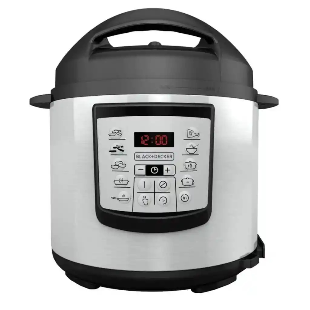 ¡Prepárese ahorrar tiempo en la cocina! La Olla de Presión de 6 Cuartos de BLACK+DECKER esla forma perfecta de preparar alimentos deliciosos. La Olla de Presiónde 6 Cuartos de BLACK+DECKER tiene sus alimentos listos para servir en la mesacon gran rapidez al sellar el calor, el vapor y el sabor durante el proceso decocción. Elija entre sietefunciones de presión para preparar todos sus favoritos: arroz, frijoles, todotipo de carne, sopas, guisos y mucho más. Usted puede hasta dorar carne con lafunción de dorar antes de cocinarla con presión, a la perfección. Otrasfunciones no relacionadas a la presión incluyen la cocción lenta tradicional(temperatura alta y baja) y mantener los alimentos calientes. La seguridad es unaprioridad con esta olla de presión y está diseñada con nueve sistemas deseguridad independientes para asegurar que la unidad funcione correctamente yde forma segura cada vez. Además, los controles digitales y el reloj de conteoregresivo hacen fácil seleccionar la función y el tiempo exactos que desea.¿Disfruta de la cocción rápida? ¿Qué le parece una limpieza rápida? La olla de cocciónde superficie antiadherente es apta para lavavajillas al igual que losaccesorios incluidos: el salvamanteles, la taza medidora de arroz y la cucharaantiadherente. También incluye unlibro de recetas repleto de comidas deliciosas, diseñado especialmente paracocinar a presión. Aumente la presión para alcanzar tiempos de cocción ¡más rápidos! Características: Capacidad 6 tazas cocidas Capacidad 3 tazas crudas Recipiente antiadherente removible Luces indicadoras Función de mantener caliente los alimentos Tapa de vidrio templado Taza medidora Cuchara para servir Cesta para cocción al vapor