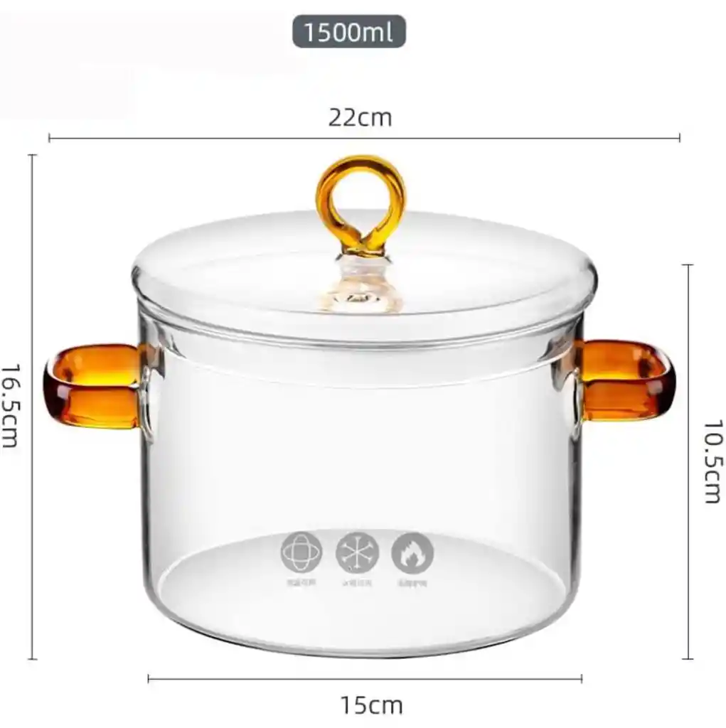 Olla de vidrio de cocina con asas dobles, ideal para cocinar pasta, sopas a fuego lento y hervir fideos,aromaticas ,bebidas calientes,sudados ,etc olla de cocina versátil. De colección diseño asas de color doracafe