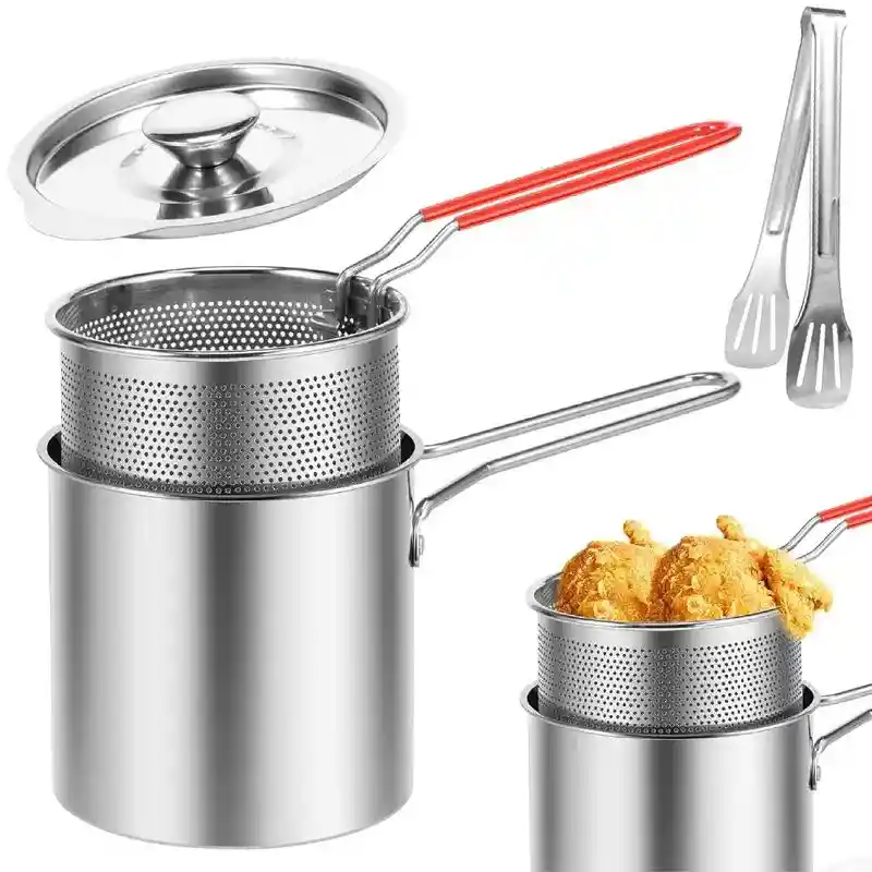 Juego de freidora de patatas fritas Gthfhadii, olla para patatas fritas, cesta para hornear, freír, hervir, cocina casera, con rejilla Nota: esta página del producto solo vende el color con rejilla para estufa con tapa, si necesitas otros tamaños o colores, consulta Preguntas y respuestas. Descripción: Material apto para alimentos: la freidora mini está hecha de material de acero inoxidable , interior liso, calentamiento rápido y uniforme, adecuado para todas las estufas. Utensilios de cocina: esta freidora con cesta de filtro es muy práctica para cocinar patatas fritas, pollo y comida en casa. Mango de silicona.