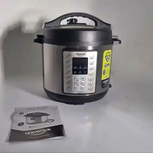 Descripción: La olla multifuncional Universal de 6 litros está diseñada para quienes buscan practicidad, rapidez y versatilidad en la cocina. Con acabados en acero inoxidable y un panel de control intuitivo, te permite realizar diversas preparaciones en un solo producto, desde cocinar arroz hasta preparar yogurt, todo de forma rápida y saludable. Su tecnología avanzada permite cocinar de manera segura con sus 13 programas automáticos, ajuste de tiempo y temperatura, y función de apagado automático. Características: Capacidad: 6 litros, ideal para preparar comidas en grandes cantidades. Material: Acabados en acero inoxidable para mayor durabilidad y fácil limpieza. Panel de control digital: Intuitivo y fácil de usar para una experiencia de cocina eficiente. 13 programas automáticos: Incluye cocción lenta, arroz, vapor, yogurt y más. Función de apagado automático: Mayor seguridad y control en la preparación de alimentos. Vasija interior antiadherente: Con doble recubrimiento para facilitar la limpieza y evitar que los alimentos se peguen. Comida saludable en instantes: Reduce el tiempo de cocción sin sacrificar el sabor ni los nutrientes.