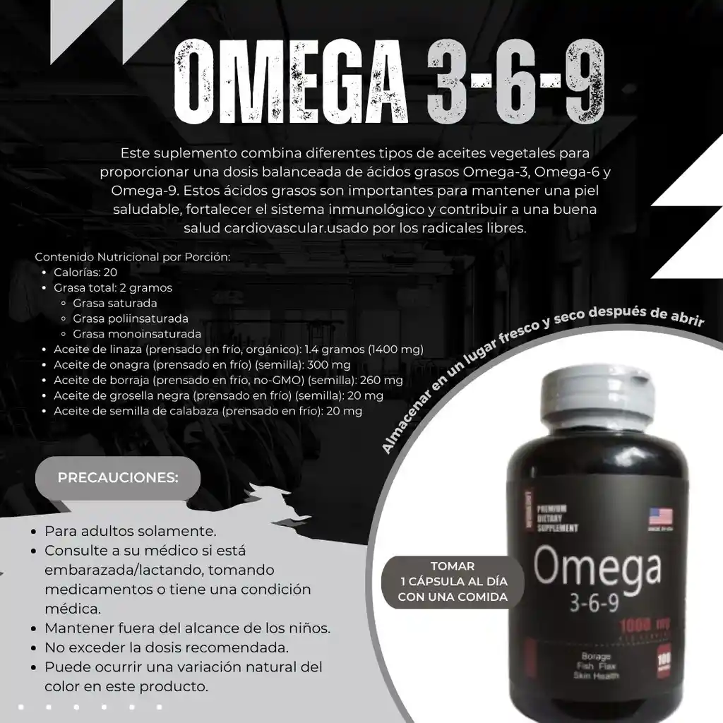 Tamaño de la porción: 1 softgel (cápsula blanda) Porciones por envase: 100 Contenido Nutricional por Porción: Aceite de linaza (prensado en frío, orgánico): 1.4 gramos (1400 mg) Aceite de onagra (prensado en frío) (semilla): 300 mg Aceite de borraja (prensado en frío, no-GMO) (semilla): 260 mg Aceite de grosella negra (prensado en frío) (semilla): 20 mg Aceite de semilla de calabaza (prensado en frío): 20 mg