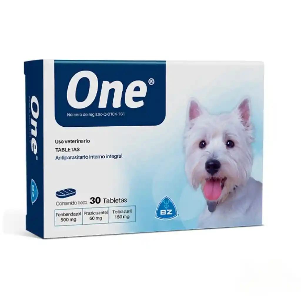 Descripción del producto Las tabletas desparasitantes One® están indicadas en perros como antiparasitario oral de amplio espectro para el control y tratamiento de parasitosis ocasionadas por protozoarios, cestodos y nematodos. Tratamiento y control de NEMATODOS (Ancylostoma spp,Strongyloides stercoralis, Toxascaris leonina,toxocara canis,Trichinella spiralis, trichuris vulpis, uncinaria stenocephala y CESTODOS (Dipylidium caninum, Echinococcus granulosus, Mesocestoides spp, Taenia spp, Spirometra mansonoides, Diphyllobothrium latum, Joyeuxiella pasqualei). One es un antiparasitario único por su formulación que ofrece amplio espectro. Contra nemotodos *cestodos y protozoarios. One es de larga acción. One tiene amplio margen de seguridad. One es de fácil fragmentación para una mejor dosificación. One de color distintivo para evitar confusiones. Composición Fenbendazol 500 mg, Praziquantel 50 mg, Toltrazuril 150 mg Dosis 1 tableta por cada 10 kg de p.v. Equivale a 50 mg/kg de fenbendazol, 5 mg/kg de praziquantel y 15 mg/kg de toltrazuril. Una sola toma Contra nematodos y Giardia: 1 tableta cada 24 horas durante 3 días. No administrar a cachorros de menos de 4 semanas Intrucciones de uso Advertencias: No administrar en animales gestantes. Administrar en cachorros a partir de las 4 semanas de edad. En caso de anafilaxia administrar corticoides de corta acción y/o antihistamínicos via intravenosa