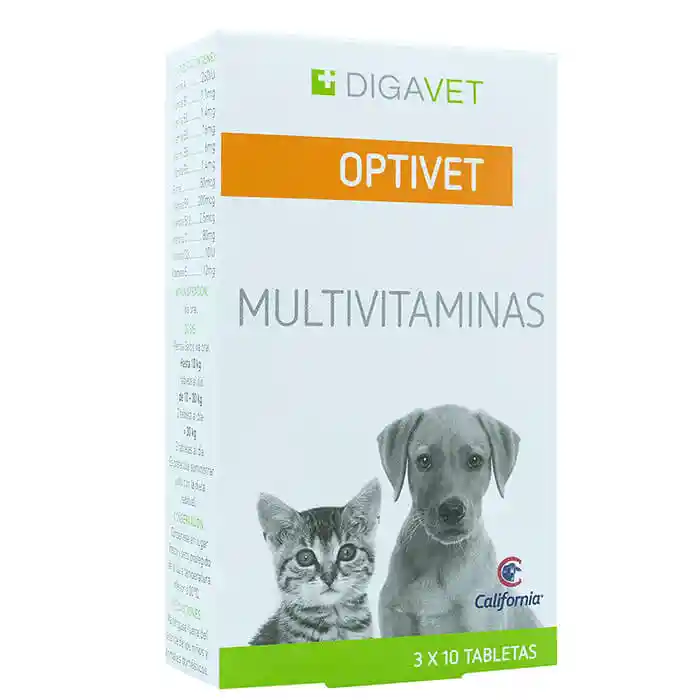 DESCRIPCIÓN: OPTIVET contiene 12 vitaminas específicamente formuladas y dosificadas para cubrir las necesidades esenciales del animal de compañía y garantizar el correcto funcionamiento de su organismo. INDICACIONES: ✓ OPTIVET está indicado para aumentar la vitalidad de los perros, previene y corrige el déficit de vitaminas y oligoelementos en general. ✓ Resuelve problemas cutáneos y el déficit de crecimiento, por lo que es ideal para perros de exposición y animales con alta actividad fisica. ✓ Funciona como coadyuvante en animales convalecientes de distintas enfermedades y como reconstituyente postoperatorio.