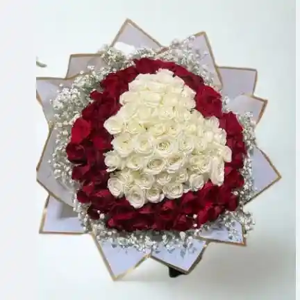Buchon de 30 rosas rojas con 30 rosas blancas. La flor puede ser sustituida dependiendo la disponibilidad de color y del producto “Mensaje Personalizado” máximo de 30 caracteres (Dejar el mensaje en el chat, los comentarios no se previsualizan para la tienda por lo que si se dejan allí no podrá ser incluido)
