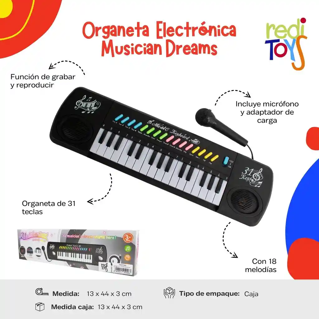 Organeta de 31 teclas Con 18 melodías 2 Ritmos Grabadora Graduación de volumen Incluye micrófono y adaptador de carga. CAJA: 13 x 49 x 4,5 cm ARMADO: 13 x 44 x 3 cm