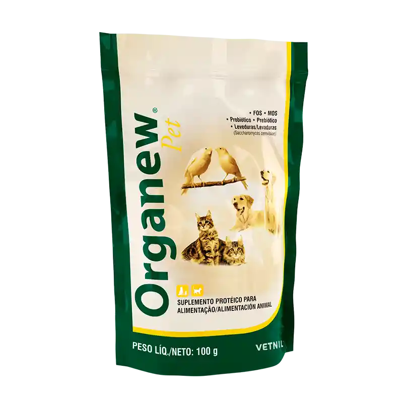 INDICACIÓN Suplemento conteniendo aminoácidos, vitaminas, levaduras y prebióticos, indicado para animales en crecimiento, aumento de peso, aumento de performance, estímulo del apetito, mejora en la conversión alimentar y en el desempeño reproductivo. Organew® Pet contiene levaduras vivas, FOS y MOS, que auxilian en el desarrollo de una microbiota intestinal saludable, proporcionando una mejor digestibilidad de los alimentos y, por consiguiente, un aumento de la eficiencia alimentar. MODO DE USAR Para utilizarse por vía oral, añadido al alimento. • Perros: 2,5 g para cada 10 Kg de peso vivo, una vez al día; • Gatos: 1 g, una vez al día; • Pequeñas Aves: 1 a 2 g por kg de ración.