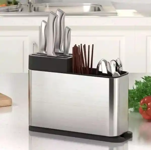 Eleva la organización de tu cocina con nuestro Organizador de Cuchillos y Cubiertos con Escurridor de Acero Inoxidable. Este accesorio es una solución práctica y eficiente para mantener tus cubiertos organizados y bien secos. Hecho con acero inoxidable de alta calidad, asegura durabilidad y resistencia a la corrosión, adaptándose a cualquier ambiente de cocina. Incluye divisiones que facilitan la organización de cuchillos, tenedores y cucharas, mientras que su base de drenaje permite que el agua se escurra rápidamente, evitando la acumulación de humedad. Posee un sistema que dirige el agua directamente al fregadero, manteniendo los cubiertos secos y listos para su uso. La construcción abierta es ideal para un secado rápido y permite una limpieza fácil, garantizando la higiene de tus utensilios. Después de lavar tus cubiertos, colócalos en el organizador para que se sequen al aire. El agua sobrante se drenará automáticamente a través de la base. DATOS TECNICOS Material: Acero inoxidable. Medidas: 20 cm x 27 cm. Peso: 500 g.