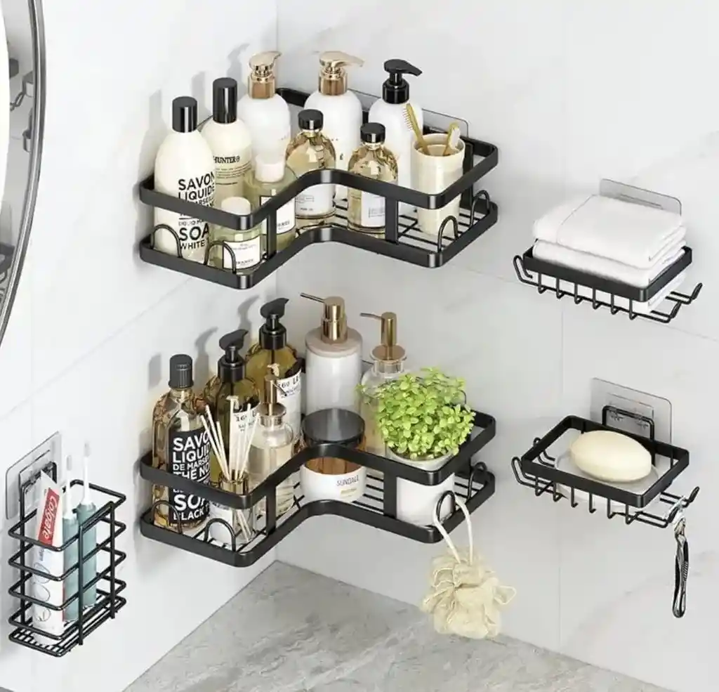 2 Estantes Esquineros: Diseñados en forma de "L" para aprovechar los rincones de la ducha, ideales para botellas grandes de champú y acondicionador. 2 Jaboneras: Estantes más pequeños específicos para barras de jabón o esponjas. 1 Soporte para Cepillos: Un organizador vertical para cepillos de dientes y pasta dental. Olímpica Olímpica +4 Características Principales Instalación sin Daños: Utiliza ganchos adhesivos de alta resistencia que soportan cargas pesadas (algunos modelos hasta 18 kg) sin necesidad de herramientas. Olímpica Olímpica +2 Diseño de Drenaje: Estructura de rejilla abierta que permite la ventilación máxima y el goteo rápido del agua, manteniendo los productos secos. Exito.com Exito.com Dimensiones: Los estantes grandes suelen medir aproximadamente 24-25 cm de ancho, mientras que los accesorios laterales como el portacepillos tienen unos 13 cm de alto. Olímpica Olímpica Versatilidad: Aunque es ideal para la ducha, también puede utilizarse en cocinas o tocadores para organizar especias u otros artículos personales.