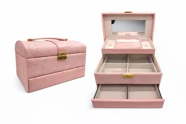 Alhajero Organizador con Cajones Espejo Joyas Anillos Caravanas es ideal para mantener tus joyas organizadas y a la vista. Espejo rectangular 2 cajones 3 pisos Tranca de seguridad Varias reparticiones para mantener el orden Informacion importante Material Madera y Espejo Color Beige o Rosado Dimensiones 30 x 20 x 15 cm Capacidad Hasta 30 piezas de joyería