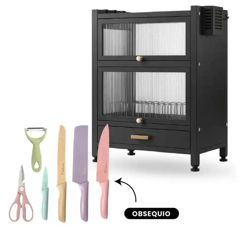 Transforma tu cocina con este organizador de loza multifuncional Su diseño elegante en acero al carbono y acrílico transparente permite escurrir y almacenar platos, vasos y utensilios de forma ordenada, higiénica y segura. Además, incluye un set de 6 cuchillos profesionales de acero inoxidable con mangos ergonómicos, ideales para cortar pan, carne, frutas y verduras con total comodidad. Ficha Técnica: Capacidad máxima: 100 lb. Medidas: 68 cm (alto) x 52 cm (ancho) x 29 cm (fondo). Puertas abatibles: Sí, con acceso seguro y práctico. Cajón extra: Sí, para almacenamiento adicional. Bandejas de drenaje: Incluidas. Patitas antideslizantes: Sí, para mayor estabilidad. Color: Negro con detalles dorados. Incluye Set de 6 piezas de cuchillería Cuchillo de chef. Cuchillo para pan. Cuchillo para carne. Cuchillo pequeño multiusos. Tijeras de cocina.