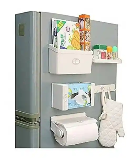 Organizador De Nevera Magnético, Especiero organizador para costado del refrigerador, ahorra espacio y organiza tu cocina. Organiza tu cocina con este practico organizador de 5 niveles para especias, toallas de papel, guantes etc Cuenta con 5 niveles para organizar todo tipo de frascos y utensilios de cocina CARACTERISTICAS · Diseñado con el mismo ancho · Material del producto: ABS + imán adhesivo fuerte · Soporte para toallas de papel: 26 x 10,3 x 9,3 cm · Estantes de gancho: 25 x 2,2 x 4,7 cm · Marco vinagrera: 25 x 4,5 x 2,7cm · Marco de caja lateral ancho: 25 x 7,7 x 4,5 cm · Rejilla para bandejas laterales: 25 x 7,7 x 3,1 cm