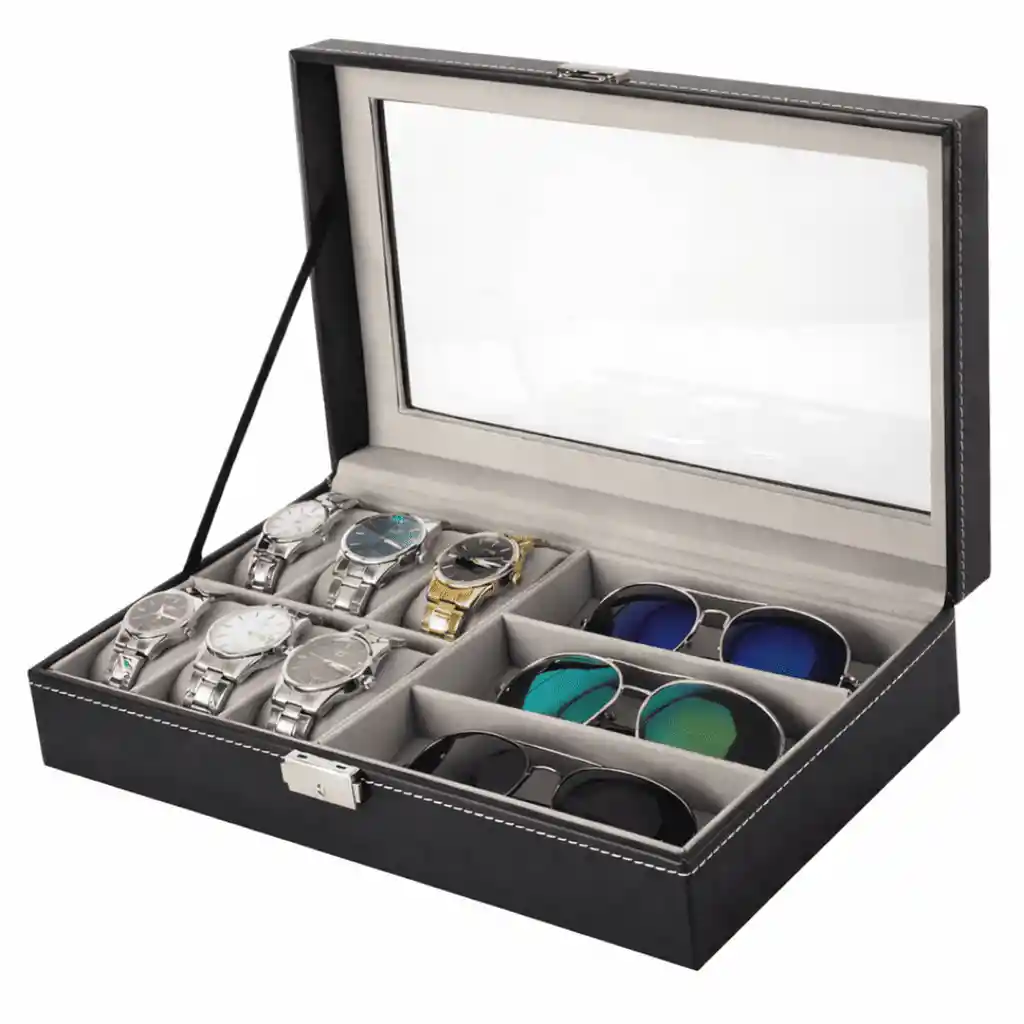 Un regalo que refleja buen gusto Si buscas un detalle útil y sofisticado, esta caja organizadora es una elección segura. Perfecta para amantes de los relojes o accesorios de moda. Combina protección, exhibición y diseño en una sola pieza. Mantiene cada accesorio en su lugar y listo para usar. Un complemento que transmite orden y estilo. Especificaciones Organizador de relojes y gafas con acabado en cuero sintético negro, interior en terciopelo suave color beige, tapa con panel transparente, 6 ranuras para relojes con almohadas removibles y 3 compartimentos amplios para gafas o joyas, cierre metálico frontal, dimensiones aproximadas 8 cm alto x 33 cm ancho x 20 cm largo, peso aproximado 1.5 kg, medidas del empaque 10 cm alto x 35 cm ancho x 22 cm largo. Incluye 1 Caja organizadora para relojes y gafas con 6 cojines extraíbles. Garantía 30 días por defectos de fabricación. Política de Retracto 5 días hábiles desde la recepción del producto, siempre que esté completo y sin uso. Nota Importante Si el producto llega golpeado o con piezas faltantes, repórtalo en las primeras 24 horas a la transportadora. Para aplicar la garantía, envía fotos y videos donde se evidencie el defecto.
