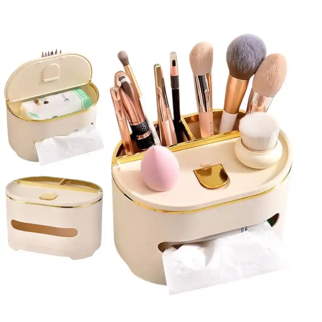 Este organizador multifuncional está diseñado para mantener tus herramientas de belleza y artículos esenciales en un solo lugar. El modelo específico mostrado es la Caja Organizadora de Brochas y Pañuelos. Características Principales Multifuncionalidad: Combina un soporte para brochas de maquillaje con un dispensador de pañuelos integrado. Almacenamiento Adicional: Incluye espacios para otros elementos como esponjas de maquillaje (beauty blenders), pinzas o incluso un soporte para el teléfono móvil. Diseño Elegante: Presenta un acabado en color crema o beige con detalles dorados, ideal para tocadores, baños o escritorios. Material: Generalmente fabricado en plástico ABS duradero y fácil de limpiar.
