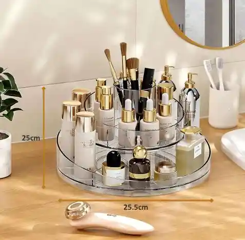 Organizador de Cosméticos Giratorio de 360° Este elegante organizador transparente es la solución perfecta para quienes buscan tener sus productos de belleza siempre al alcance de la mano. Su diseño multinivel permite clasificar desde brochas hasta perfumes de forma eficiente y estética. Características del Producto: Rotación Completa: Base giratoria de 360 grados que facilita el acceso rápido a cualquier producto sin tener que mover otros objetos. Capacidad de Almacenamiento: Compartimento Central: Diseñado específicamente para mantener las brochas de maquillaje y pinceles en posición vertical y organizada. Nivel Superior: Espacio segmentado para frascos pequeños, sueros o esmaltes. Base Amplia: Área perimetral espaciosa ideal para frascos de mayor tamaño, cremas, lociones y perfumes. Material de Alta Calidad: Fabricado en acrílico transparente de alta resistencia, que permite visualizar todo el contenido de un vistazo y combina con cualquier decoración. Diseño Compacto: Optimiza el espacio vertical, ayudando a despejar superficies abarrotadas. Dimensiones: Dimensión Medida Altura Total 25 cm Diámetro de la Base 25.5 cm Beneficios Clave: Orden Inmediato: Transforma un mostrador desordenado en un espacio digno de un profesional del maquillaje. Versatilidad: Aunque está diseñado para cosméticos, también es útil para organizar productos de cuidado de la piel (skincare) o artículos de higiene personal. Fácil Limpieza: El material plástico permite una limpieza rápida con solo un paño húmedo.