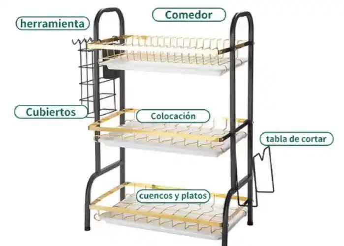 Organizador y escurridor de aluminio de tres niveles para platos, vasos y utensilios.