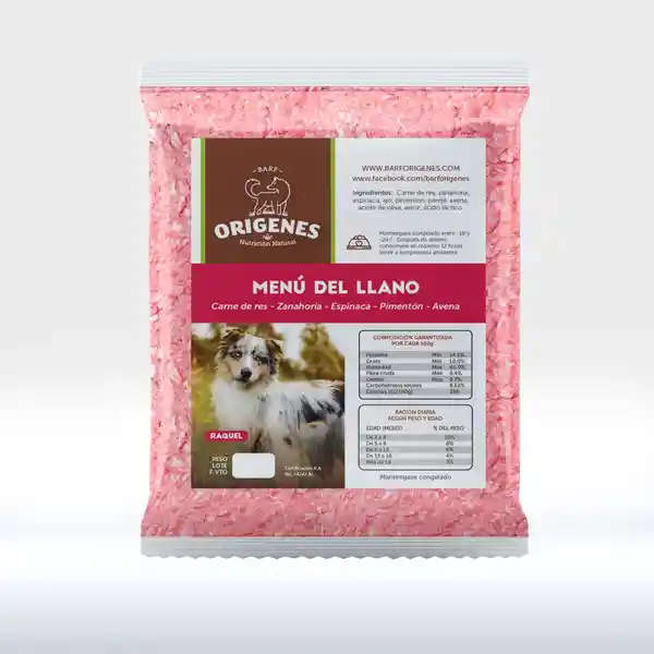 Orígenes Menú Llano Res Elaborado a Base de Carne de Res Enriquecido Con Verduras Fibras Aceites y Suplementos Ideal Para Perros Con Alta Actividad Física Sin Colorantes Azucares Harinas Cárnicas ni Saborizantes. 500 Gr