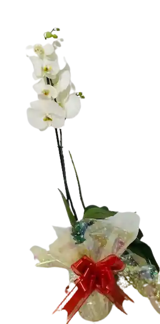 Orquídea de 1 vara altura aproximada 60 a 65 cm. Incluye tarjeta, escribe a quien va dirigida Orquidea de color Blanco con Matera decorativa Si, de 1 espigas