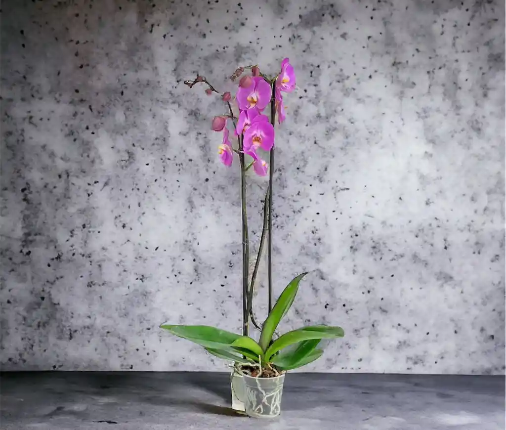 Orquídea de 2 varas altura aproximada 60 a 65 cm. Incluye tarjeta, escribe a quién va dirigida. Orquidea de color Morado con Matera decorativa Si, de 2 espigas