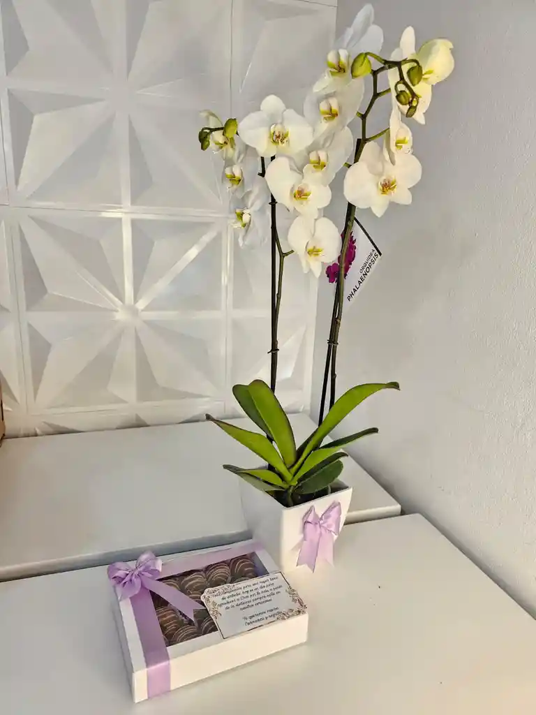 orquidea de 2 varas, caja de 14 fresascon chocolate y tarjeta dedicatoria