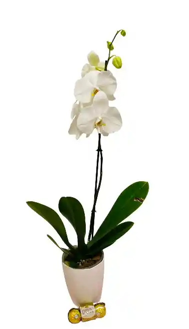 Orquídea de 1 vara blanca, incluye matera plástica y chocolates Orquidea de color Blanco con Matera decorativa Si, de 1 espigas