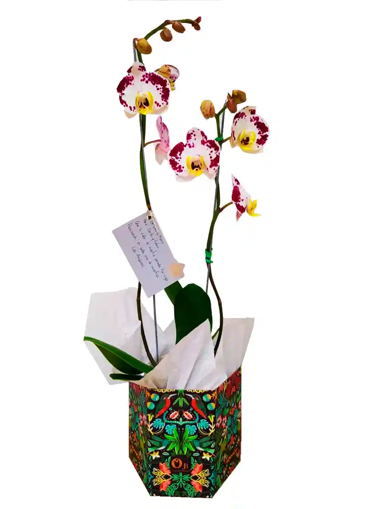Orquídea de 60 cm de alto. color blanco con manchas moradas y centro amarillo. empacada en empaque de regalo. Orquidea de color Morado con Matera decorativa Si, de 2 espigas , Orquídea de 60 cm de alto. color blanco con manchas moradas y centro amarillo. empacada en empaque de regalo. Orquidea de color Morado con Matera decorativa Si, de 2 espigas