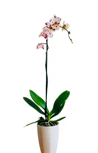 Orquídea de una vara blanca con morado, incluye matera de plástico y tarjeta personalizada dejar el mensaje en los comentarios Orquidea de color Blanco con Matera decorativa Si, de 1 espigas
