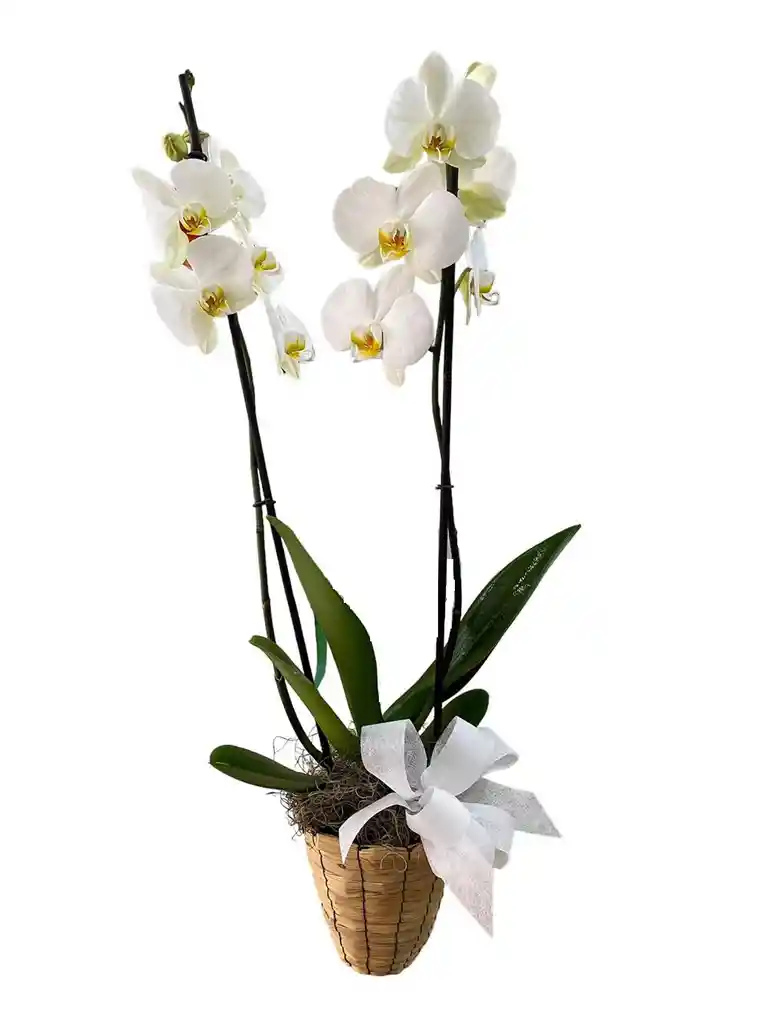 Planta Orquídea Phalaenopsis de 2 Tallos Premium blanca Donation incluye matera artesanal y tarjeta para dedicatoria (Favor Escribir Mensaje Por el Chat)